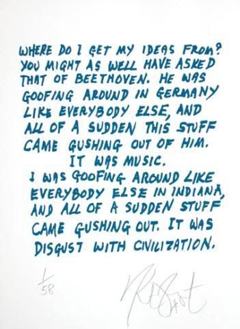 I had time to read this past week, but no time to really stop and analyze. I just wrote down nice quotes on an index card. So now that I'm analyzing some of Vonnegut's nonfiction, I really like the way he thinks.